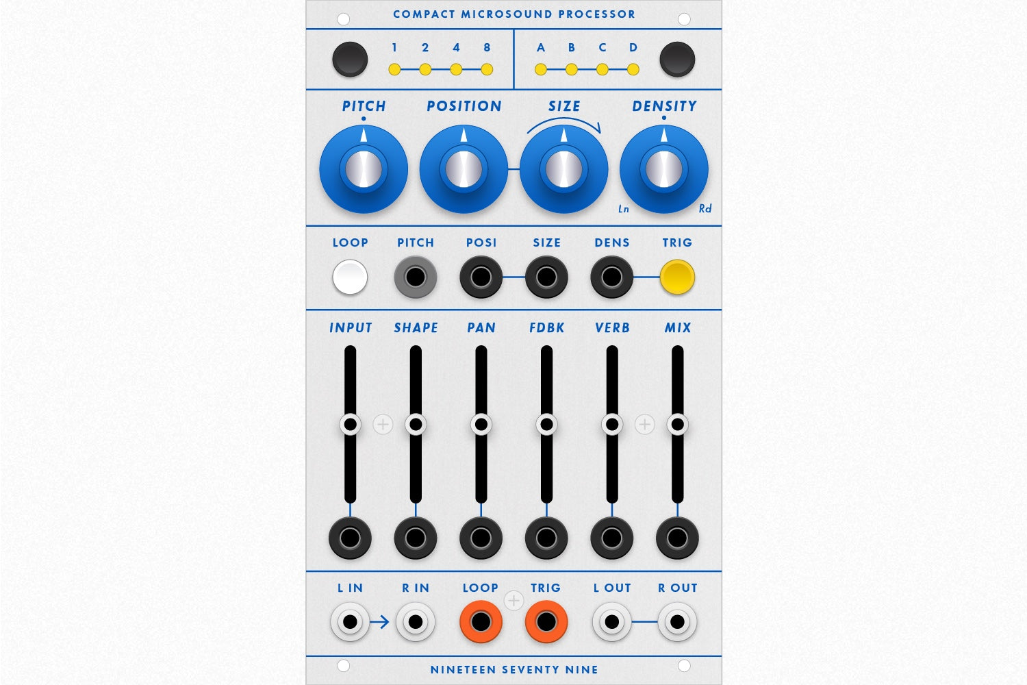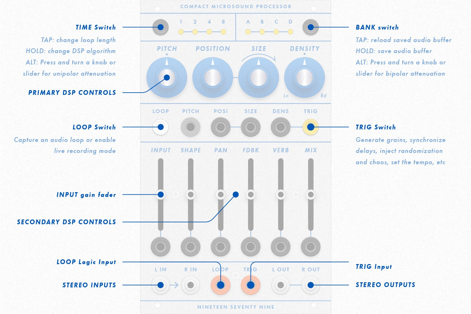 Saving/loading audio loops. When the LOOP LED is on, you can save the captured audio buffer and reload it later. There are four memory banks labeled A-D. Press the BANK switch (upper right) for a few seconds. The LEDs will indicate the current memory bank. Tap the switch if you want to change which bank the audio will be saved into (by default it will be saved into the current bank). Once you've chosen a bank, press the BANK switch for a few seconds to save the audio permanently into the module's memory. To exit without saving, simply wait a few seconds and the selection mode will automatically exit after a few seconds. After saving or exiting, saved audio buffers can be loaded by tapping the BANK switch to cycle through the four memory banks (A-D). If the LOOP switch is turned off after loading, the audio buffer will be cleared and live recording will begin. However you can recall the current memory bank by pressing TRIG and then BANK. This will reload the saved buffer and reactivate the LOOP switch.