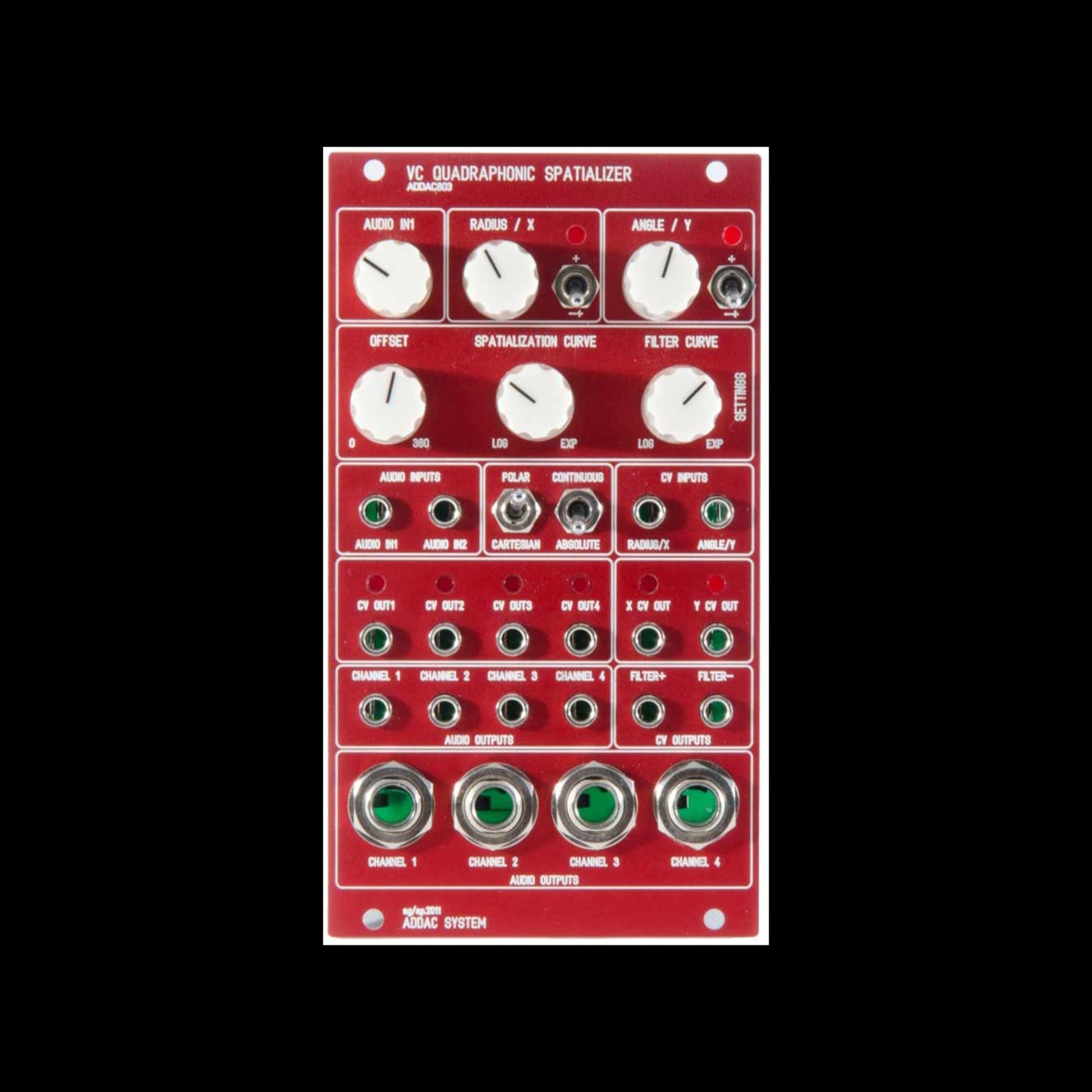 When a modulation signal is plugged into the corresponding CV input, the knobs act as CV attenuators. X/Y CV outputs put out a voltage that follows the X and Y position in Cartesian mode. Each of the four channels has a CV output that mirrors the panning behavior and is indicated by LEDs. The filter +/- outputs provide voltages that change relative to the distance to the spatialization edges and reacts to the filter curve knob. These can be used to create naturalistic filtering effects, for example, by modulating a lowpass filter cutoff as a sound moves from a center position, eliminating higher frequencies as the sound moves from the center. Spatialization curve sets the amount of spatialization and offset manually sets the offset for the angle parameter. The four output channels are produced both on Eurorack standard and line-level quarter inch instrument jacks.
