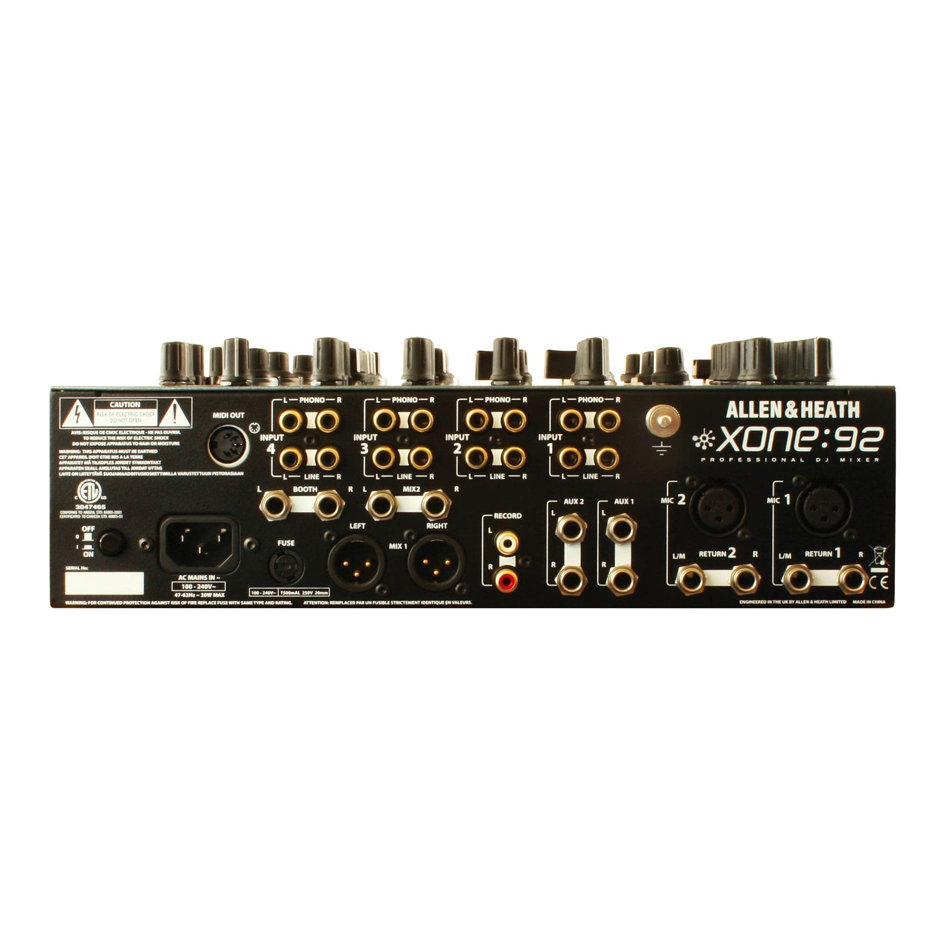 The XONE:92 has 6 dual stereo channels, two offering mic inputs, adding up to a massive 10 stereo and 2 microphone inputs. XONE:92's full range of connectors means that you can connect up to 4 turntables to the Xone:92, 2 mics, CD players, MD players, drum machines, samplers, and pretty much anything else you might want to bring into the mix.
