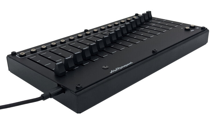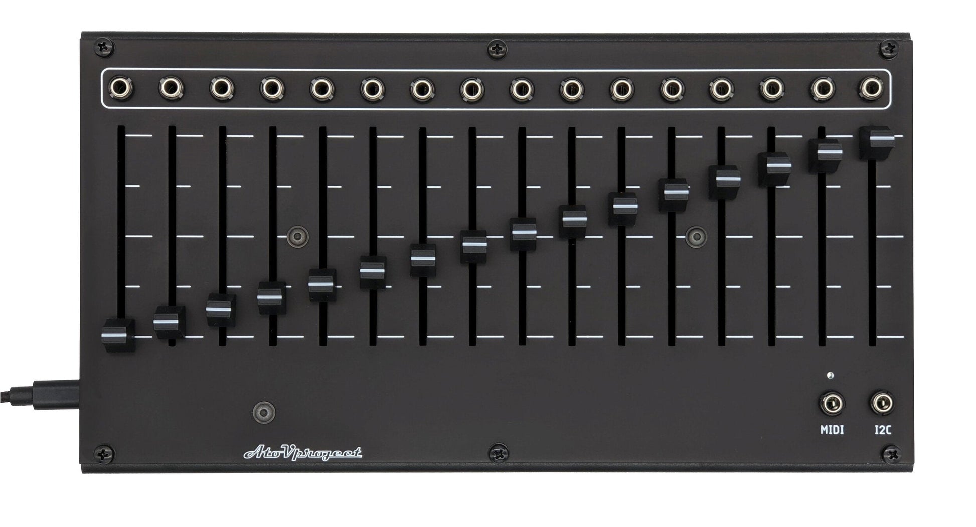 The 16n AtoVproject Rework is a controller sending CV, I2C, MIDI jack, USB MIDI (compatible PC, Mac, iPad etc...), making it the absolute ultimate controller for any of your hardware and software all in one!