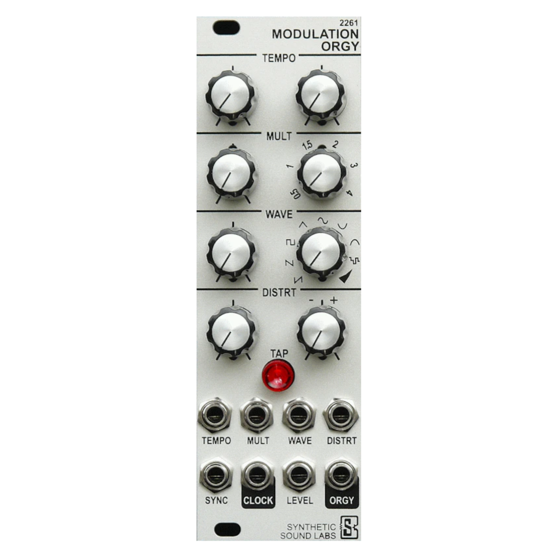 The 2261 Modulation Orgy is a unique Low Frequency Oscillator (LFO) that offers unmatched modulation flexibility. It features both manual and external voltage control over LFO Tempo (speed), tempo Multiplier, Waveform and Waveform Distortion.