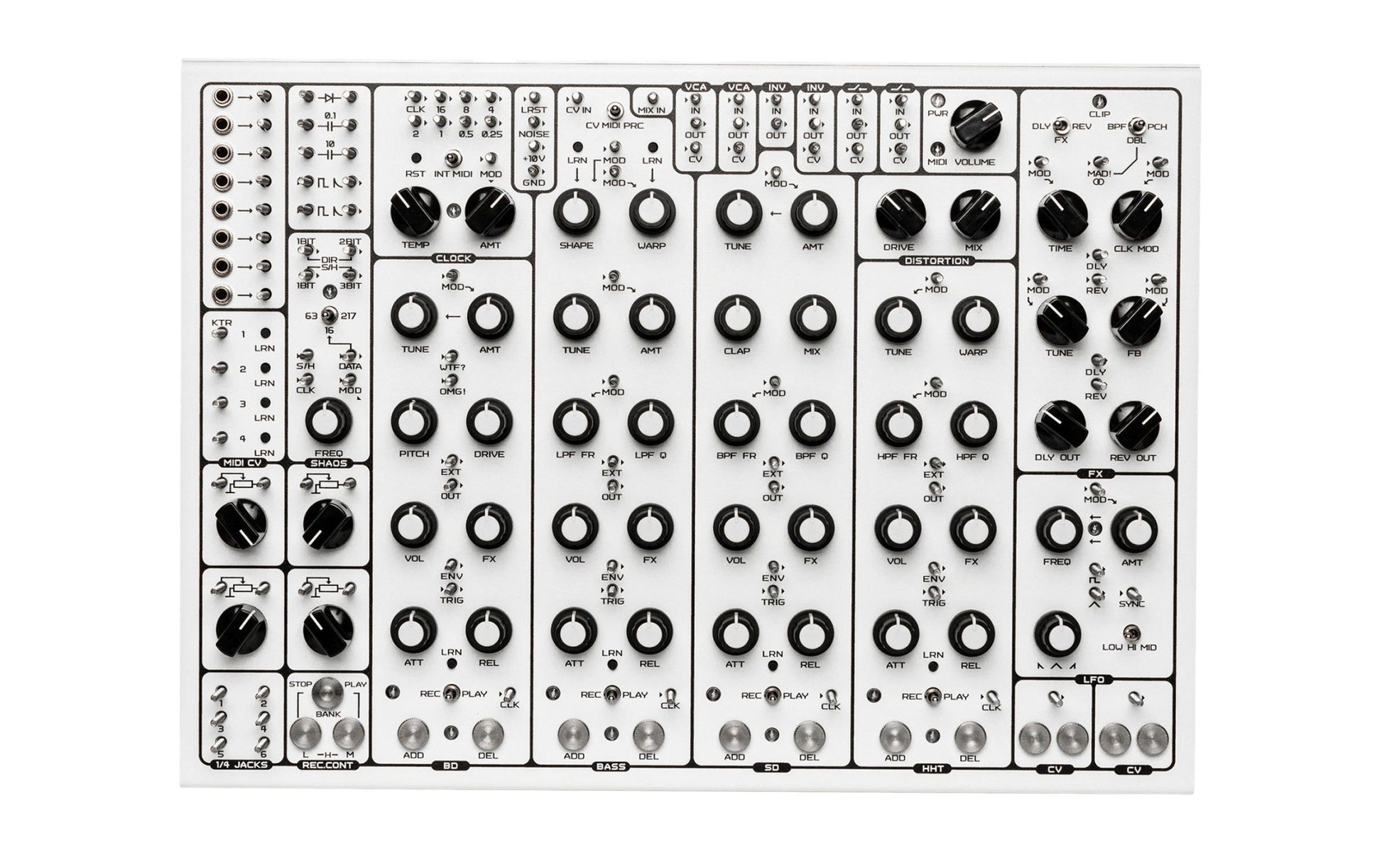 - Full MIDI implementation: MIDI learn, pitch control on BASS voice, 4x MIDI-CV converters